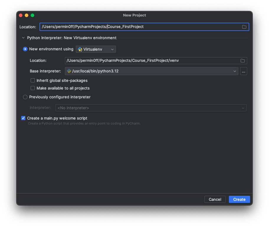 Вводим название проекта Course_FirstProject и нажимаем создать: